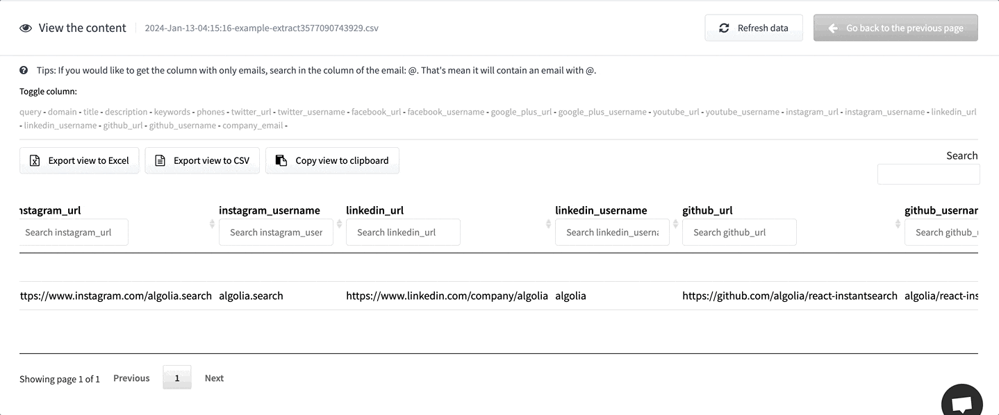 You can upload a list of domains and extracts emails, social media URLs, and usernames (Facebook, Twitter, etc.), phone numbers on all pages of each website. A report is available to download as Excel once all the emails are extracted. This is the best solution to extract all emails from a list of websites (companies).